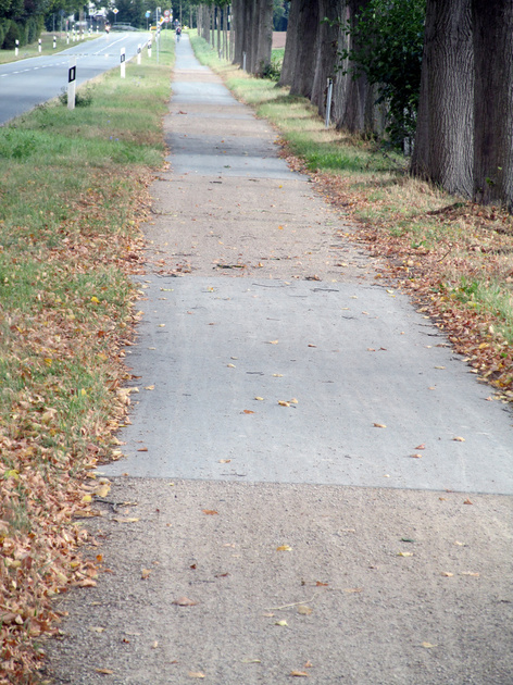 Bestrijding van wortelopdruk bij bomen door stukken met gestabiliseerd zand als wegdek van het fietspad in Duitsland (bij Wehrbergen)