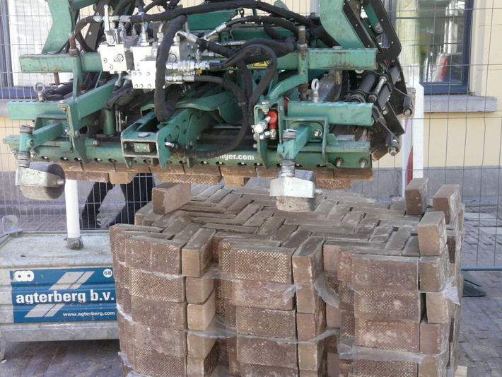 Klinkerbestrating: kraan legt de in keperverband aangeleverde steen