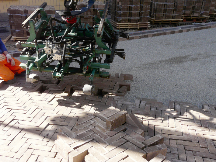Klinkerbestrating: kraan legt de in keperverband aangeleverde steen