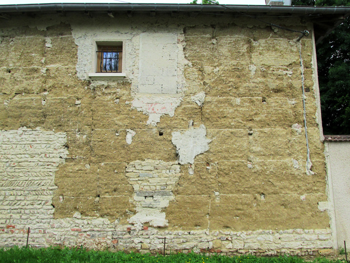 . Een gedeelte is in fasen opgetrokken in natuursteen, daarna is fasen uitgebreid en verhoogd in stampbouw (pisé).