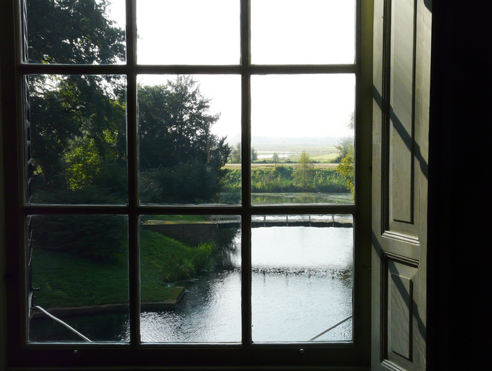 , uitzicht naar de uiterwaarden door een venster van de achtergevel