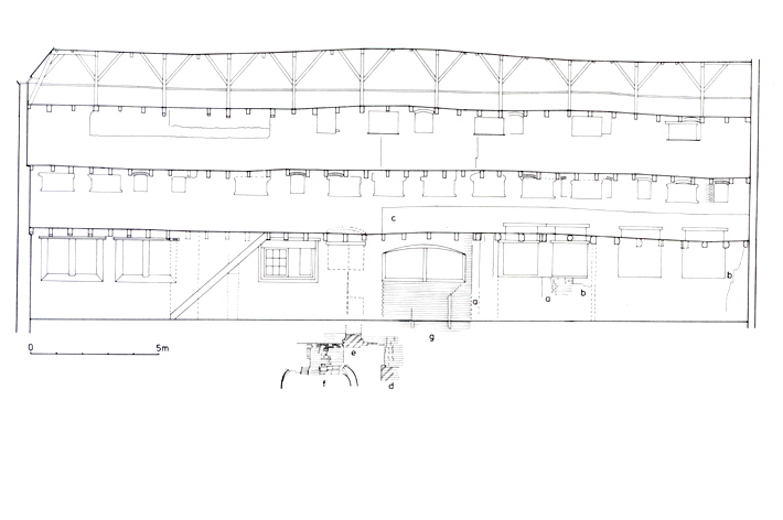 Omschrijving: Utrecht - Oudegracht 229 (oud adres) = Pandhuis. Afb. 197 Oude Gracht 229. Langsdoorsnede met de bouwsporen in de noordmuur. A: sleuven voor muurstijlen. B: sporen van oorspronkelijke vensters. C: borstwering van het 14e-eeuwse huis. D: fundering van de oorspronkelijke westgevel. E: 16e-eeuwse fundering. F: middeleeuwse beerput. G: middeleeuwse doorgang. In de 17e-eeuwse verlenging en verhoging is een reeks pakhuisvensters teruggevonden, die in de 18e eeuw door een nieuwe reeks zijn vervangen.